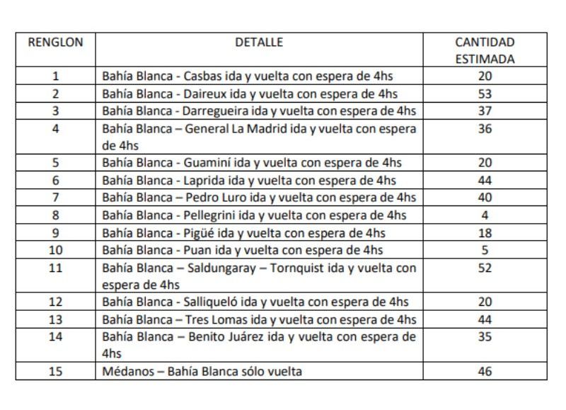 En el documento detallan la contratación del servicio de remises para el traslado de docentes desde Bahía Blanca, hasta las sedes y subsedes académicas, ubicadas en las localidades de Casbas, Daireaux, Darregueira, General La Madrid, Guaminí, Laprida, Pedro Luro, Pellegrini, Puan, Pigüé, Saldungaray, Tornquist, Salliqueló, Tres Lomas, Benito Juárez y Médanos, durante el primer cuatrimestre del ciclo lectivo 2024.