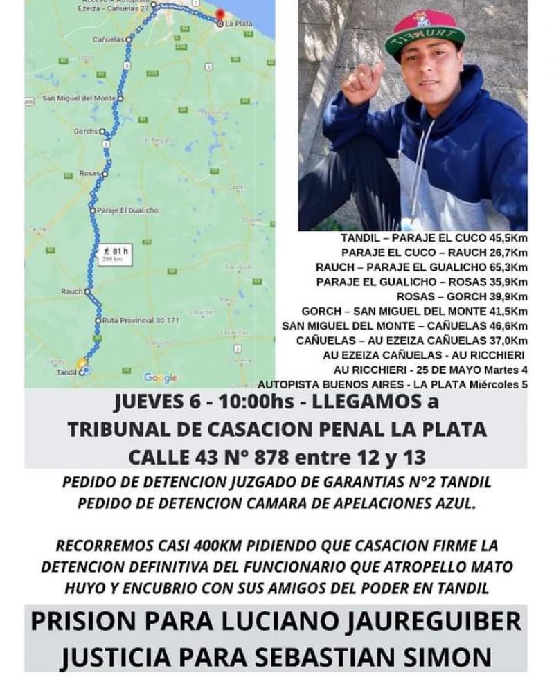 Familiares y amigos del joven Sebastián Simón se encuentran marchando desde Tandil hacia los Tribunales de Casación con sede en La Plata, para pedir la detención del ex director de Espacios Verdes, Luciano Jaureguiber, quien lo atropelló, mató y huyó del lugar.