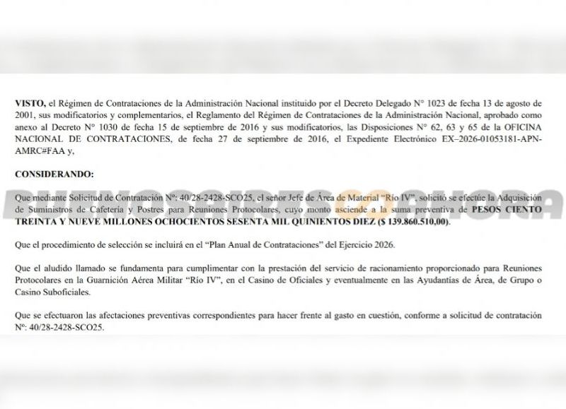 El cual también justificó que "el aludido llamado se fundamenta para cumplimentar con la prestación del servicio de racionamiento proporcionado para Reuniones Protocolares en la Guarnición Aérea Militar “Río IV”, en el Casino de Oficiales y eventualmente en las Ayudantías de Área, de Grupo o Casino Suboficiales".